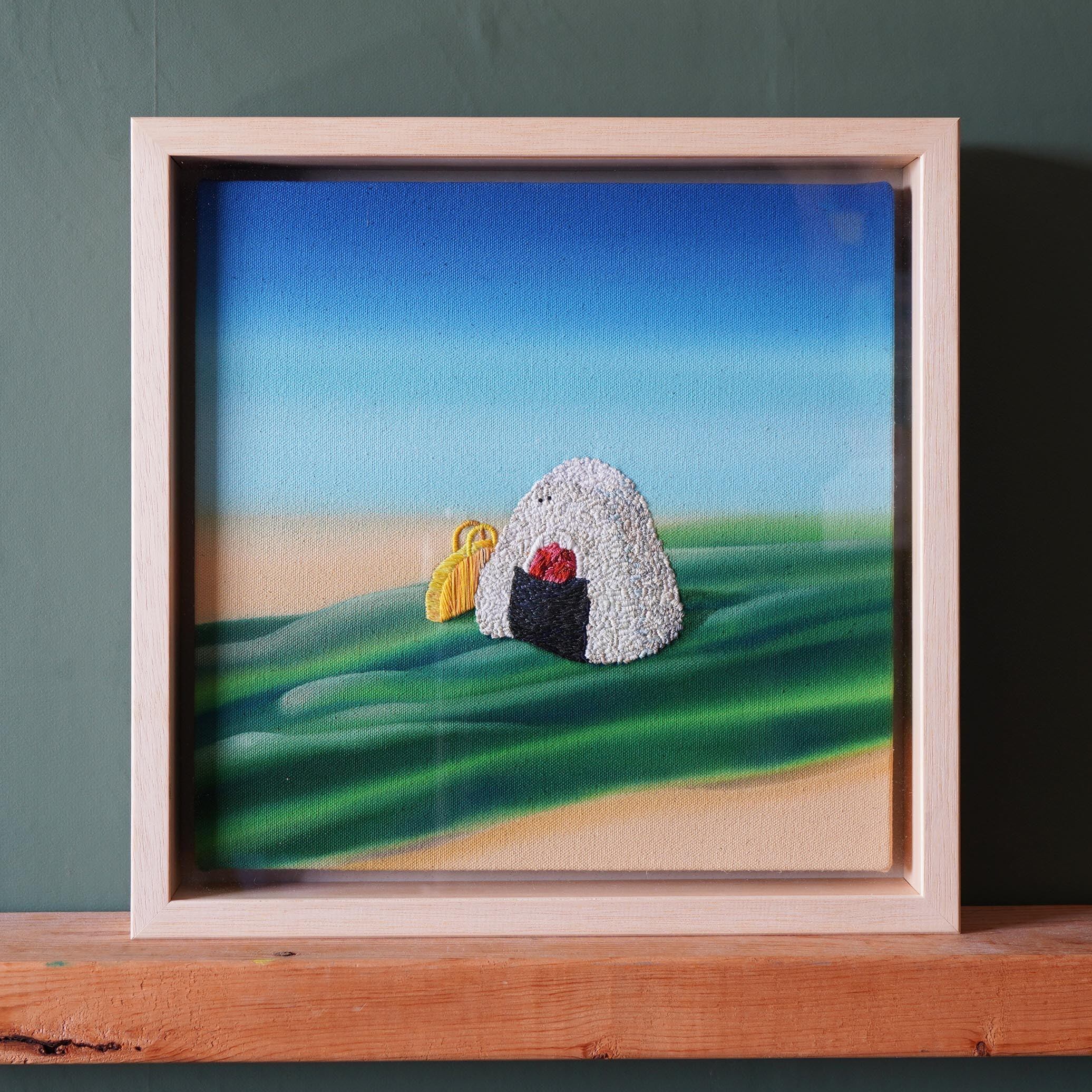2022年12月に開催されたグループ展 ” 童謡 Kawaii レコジャケと楽しい作品展 ”に出品した、童謡「おにぎりころりん」をモチーフに制作した作品「Take me with you.」